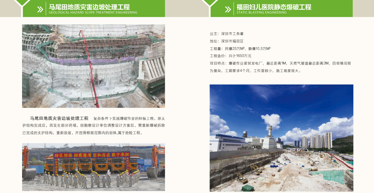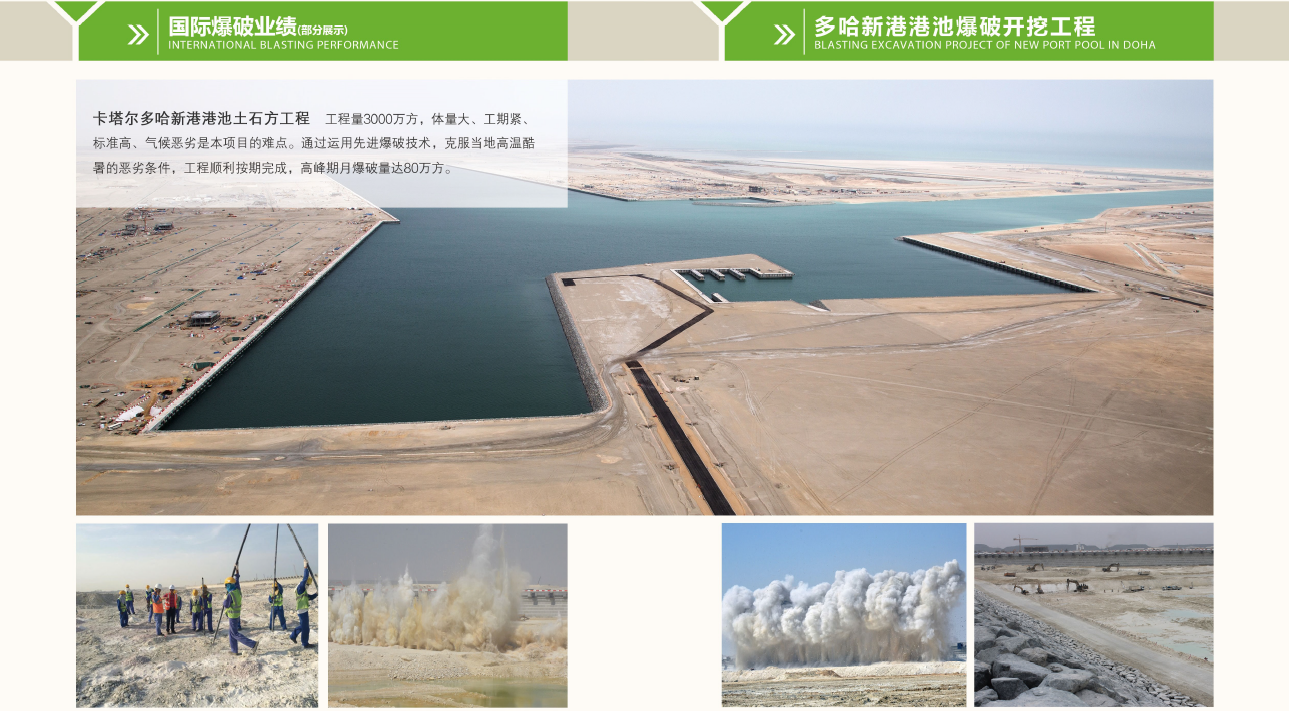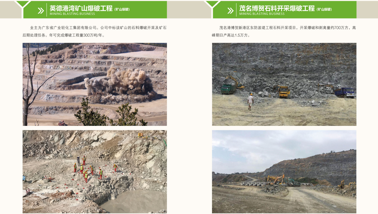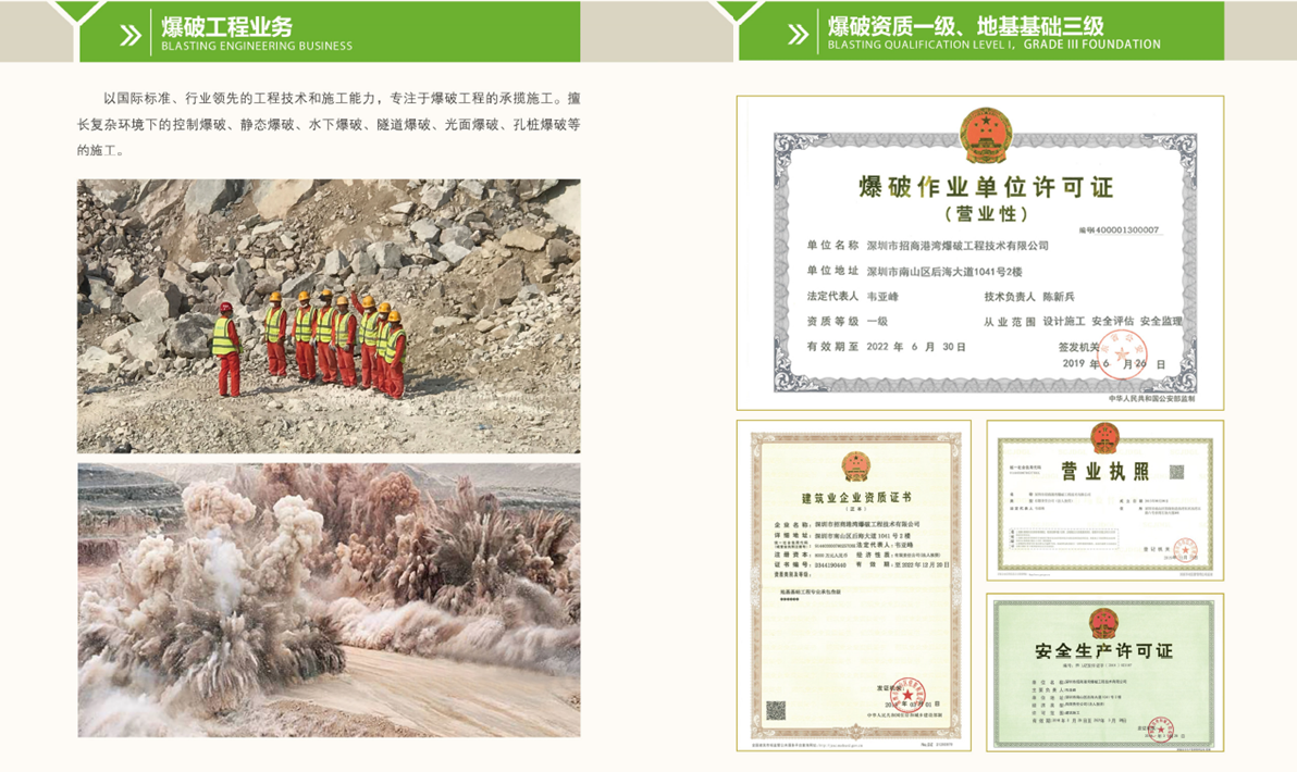 公司具有爆破作业单位一级资质,可专业从事爆破设计施工、安全评估、安全监理;具有建筑业地基与基础专业承包三级资质。公司可承担项目范围包括:地基与基础工程、土石方工程、市政公用工程、水利水电工程的施工;爆破与拆除工程、水下爆破工程、水下深孔爆破工程、水下炸礁工程、水下爆破拆除工程等。近两年来,公司先后承担国内爆破工程近30项,爆破工程量达1100万立方米;代管集团砂石矿山7个,年产各类砂石1000万吨以上。