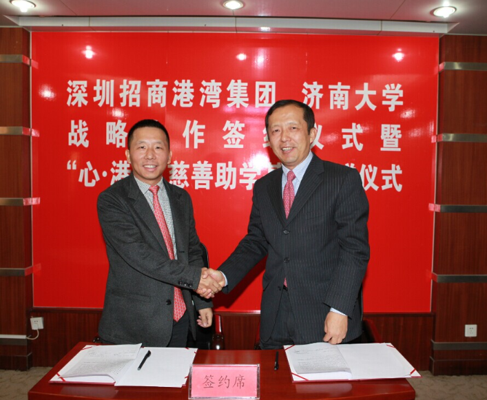 11月12日,集团总裁刘裕率队前往山东与济南大学签署战略合作协议并进行 “心•港湾”慈善助学基金捐赠启动仪式。集团董事会顾问、港创建材董事长韩桂茂,集团副总裁、财务总监徐建,港创建材总经理马凌风,燊泰基(金业)石场总经理刘晓龙,生科源总经理窦文祥,潍坊招商科瑞总经理杨瑞,集团企业管理部副总经理董海嘉,投资发展部副总经理孙录科等陪同前往。济南大学党委书记范跃进、校长程新热情的接待了集团一行。