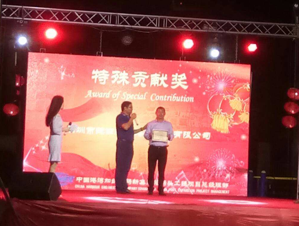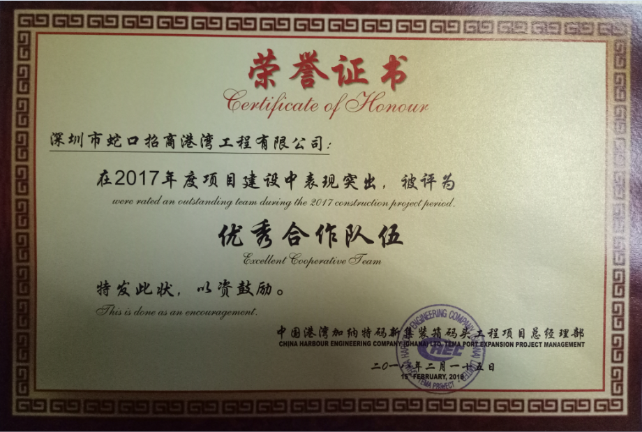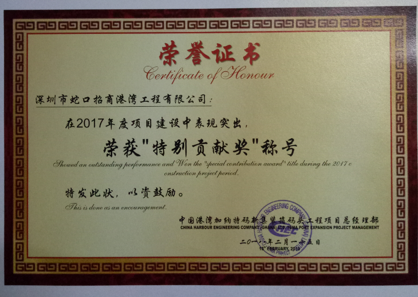 简讯 近日,中国港湾总经理部对所有合作队伍进行了全面考评,招商建设国际有限公司加纳项目部获得“特别贡献奖”和“优秀合作队伍”荣誉称号,并获得总项目部5.5万塞地币的物质奖励。中国港湾加纳特马新集装箱码头工程项目总经理部总经理杨建冲为招港国际加纳项目部颁发荣誉证书,并寄语招港国际加纳项目部2018年继续发扬优良风格,发挥优势,争取更好的成绩。