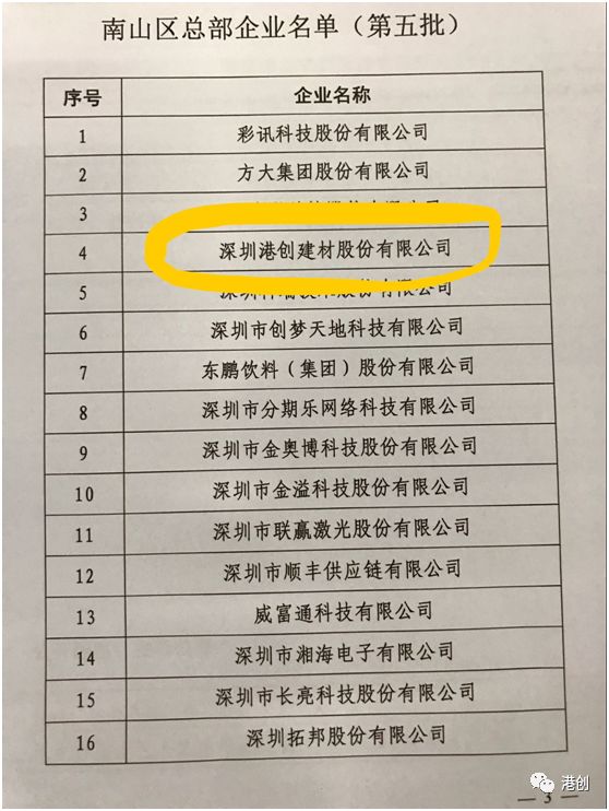 深圳港创建材股份有限公司荣获第五批“南山区总部企业”荣誉称号