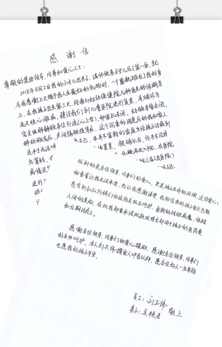 探望过程中,探望同事亲切地与刘兴伟交谈,详细了解其小女儿的病情和治疗情况。亲切的话语使刘兴伟一家深刻地感受到了公司对他们的关爱,刘兴伟对公司的牵挂和慰问表示由衷地感谢,赠予了公司一面“心系员工 恩重如山”的锦旗及书写了一封感谢公司领导、同事及爱心同仁的感谢信。