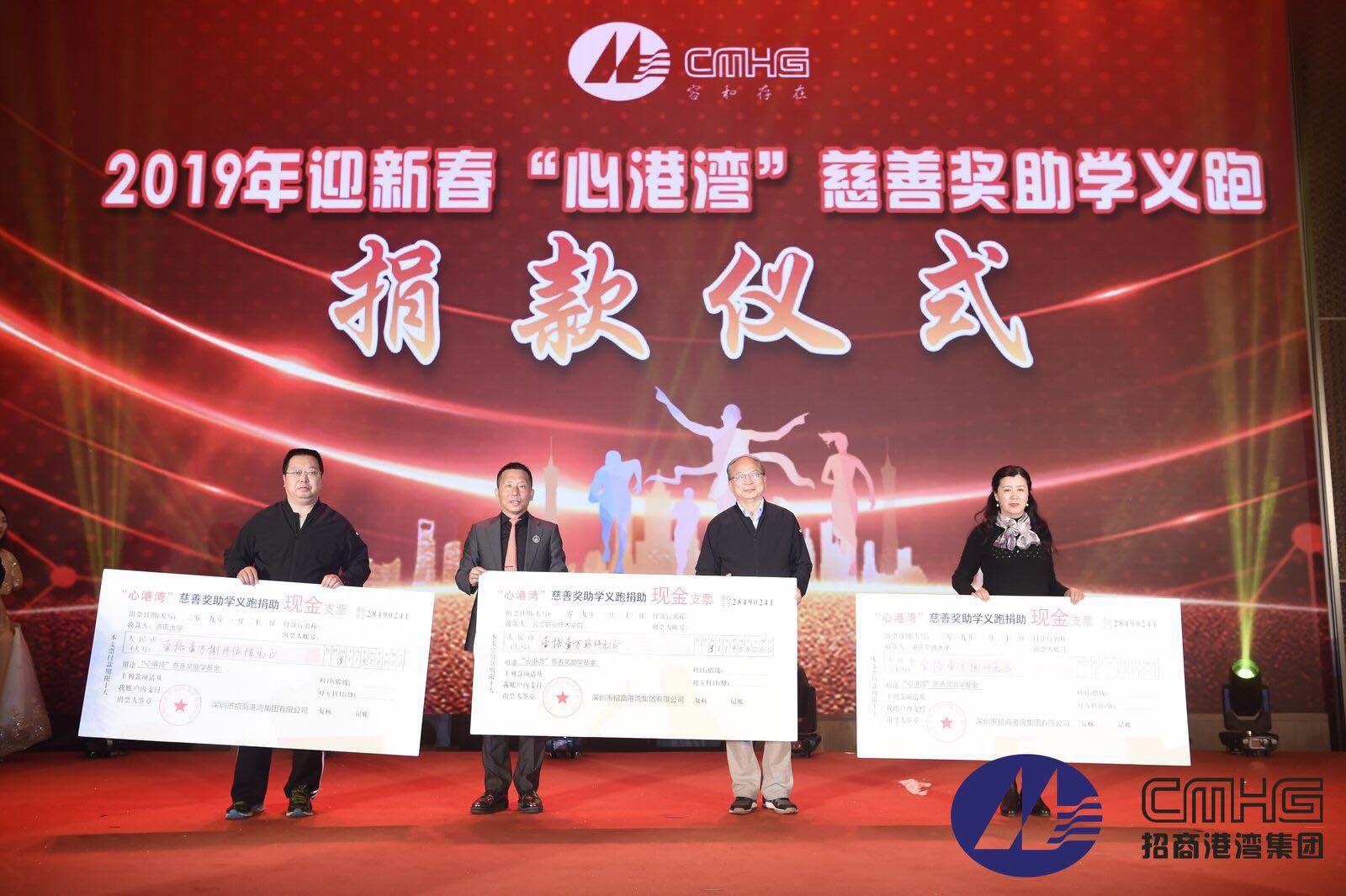 晚会期间,在观看下午举办的2019年迎新春“心港湾”慈善奖助学义跑花絮后举行了捐款仪式,集团董事长、总裁刘裕代表集团向济南大学、重庆交通大学和九江职业技术学院三校移交了捐款。九江职业技术学院党委书记魏寒柏致感谢词,并对集团致以美好祝愿,获得了全场的热烈掌声。
