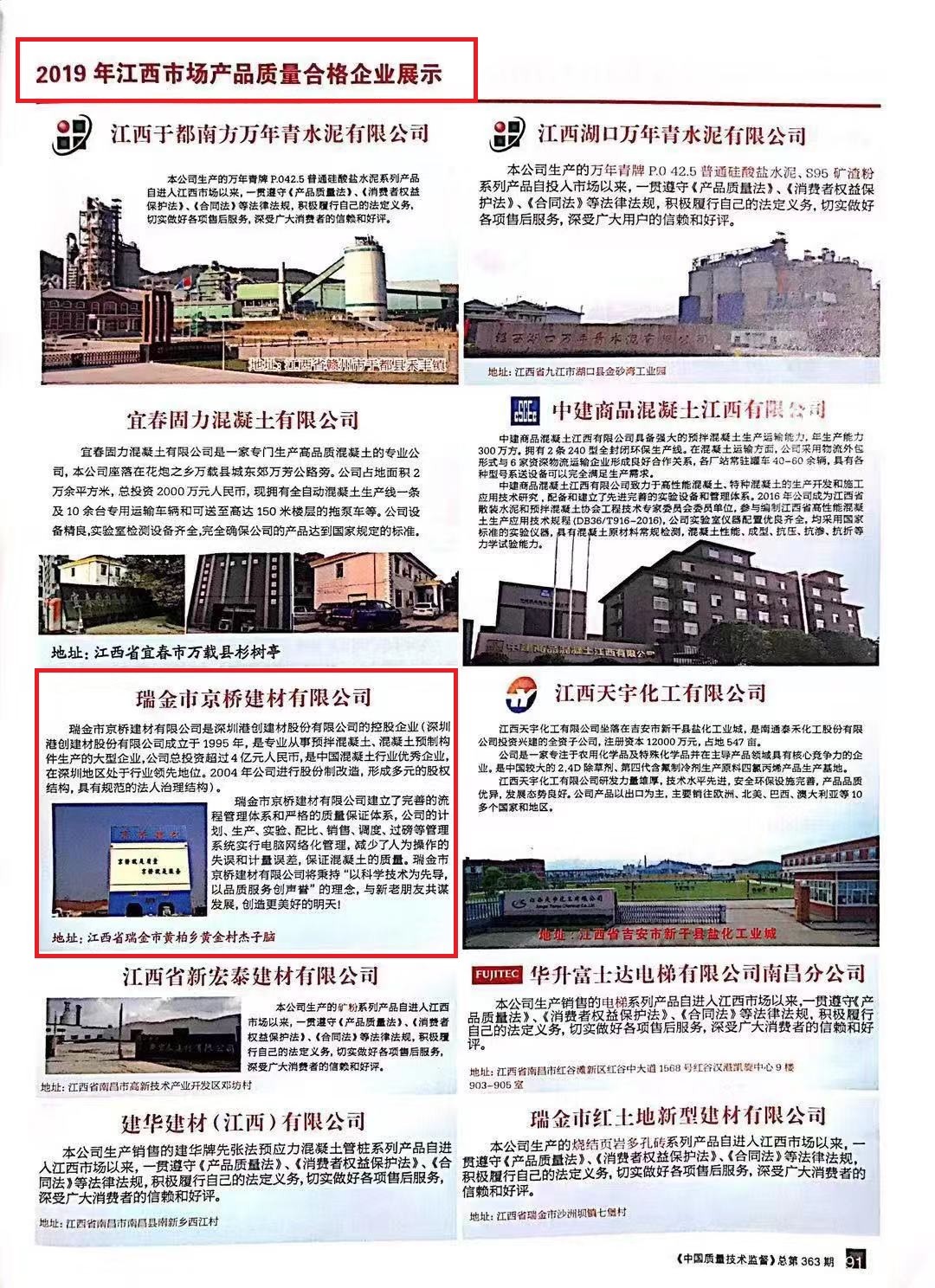 2018年10月,江西省质监局开展建材行业产品质量监督抽查工作。瑞金市京桥建材有限公司产品在质量抽查过程中,各项指标优异,于2019年3月被刊登在《中国质量技术监督》2019年第363期江西市场产品质量合格企业展示专栏。