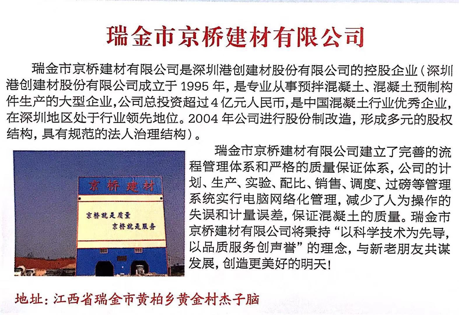 瑞金京桥公司拥有一支非常年轻且充满活力的管理团队。在极其激烈的市场竞争环境下,公司全体人员锐意进取、攻坚克难,以总公司深圳港创建材股份有限公司“港创就是质量,港创就是服务”的经营理念为发展方向,加强信息化管理,完善质量管控体系,打造了“京桥就是质量,京桥就是服务”的良好口碑。