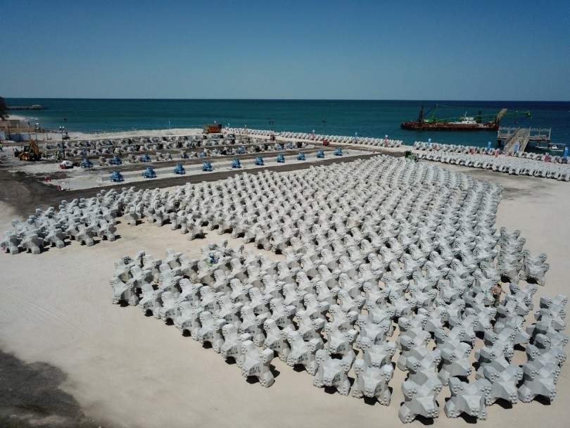 上午9时45分,贠总一行抵达公司科威特国家卫队游艇码头项目混凝土方块预制现场,公司项目管理班子成员给予了热情接待。贠总饶有兴致地视察了预制场,并仔细询问了方块预制的进展情况。随后,大家到达扭王块预制场和海上施工现场。扭王块预制场是在绞吸疏浚沉降池的基础上平整形成的,现已存放扭王块1074块,每天新增30块。
