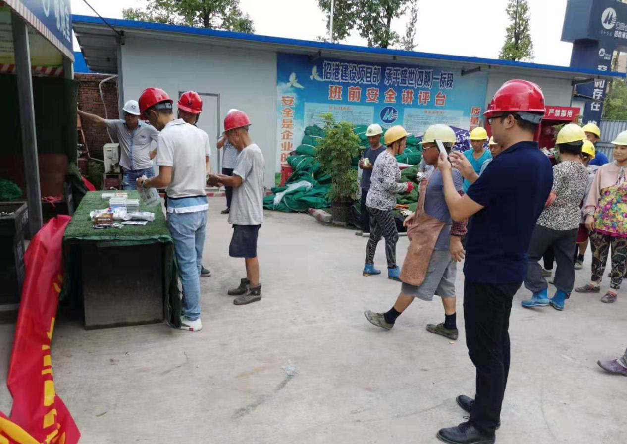 建设单位工程部经理郭超文、施工单位招港建设公司安全负责人张成和对高温天气下仍然坚守在一线的工作人员表示衷心感谢,为他们发放了精心准备的十滴水、藿香正气液、清凉冲剂、风油精等一系列防暑降温用品,还叮嘱大家夏季高温作业时,注意防暑降温、保重身体,切实保障安全生产。