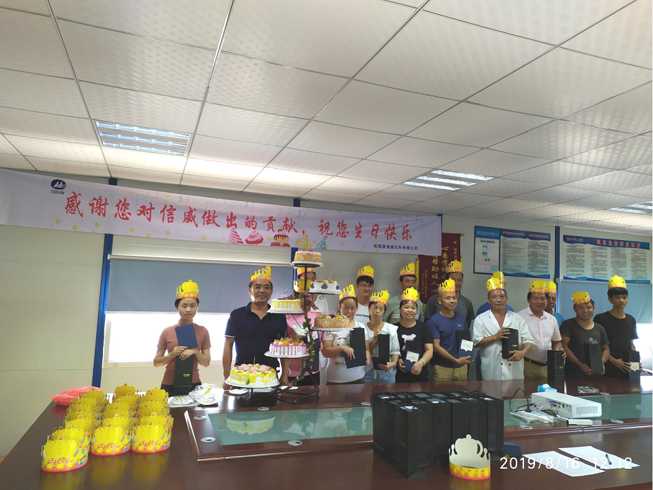 为感谢员工辛勤的付出和努力,让员工真切感受到公司大家庭的温暖,8月16日,阳西县信威石料有限公司为2019年1月—8月生日的39名员工举办了一场别开生面的集体生日会。