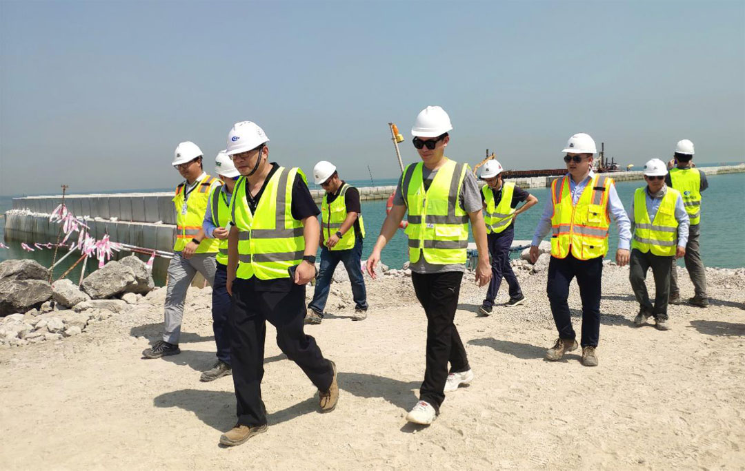 9月23日,中国港湾工程有限责任公司总经理助理、中东区域管理中心总经理夏新瑞、中国港湾科威特办事处总经理黄祖华莅临招商建设国际有限公司科威特国家卫队游艇码头项目部视察指导工作。