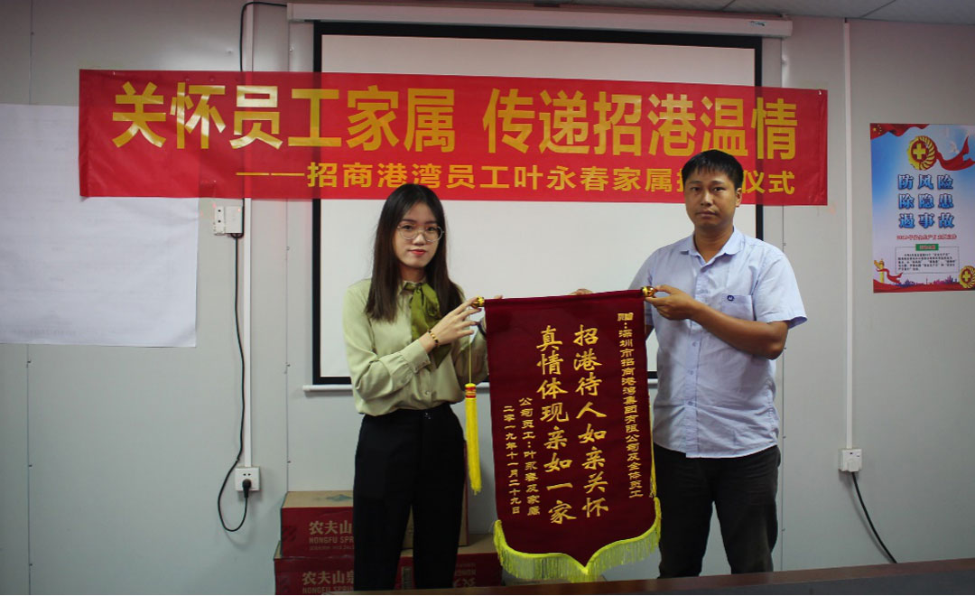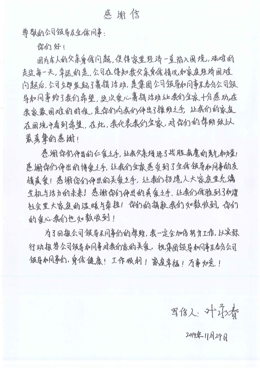 现场举行了简单的捐助仪式,叶永春代表家人对公司领导和同事们的爱心捐助表示感谢,并将写着“招港待人如亲关怀 真情体现亲如一家”的锦旗赠予集团,他还手写了一封致公司领导及全体同事的感谢信。