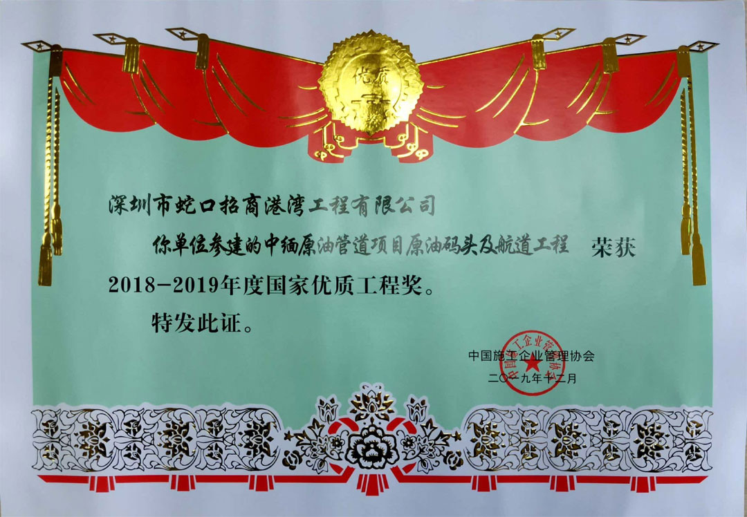 近日,从中国施工企业管理协会传来喜讯,由深圳市蛇口招商港湾工程公司参建的中缅原油管道项目原油码头及航道工程项目荣获2018-2019年度国家优质工程奖。