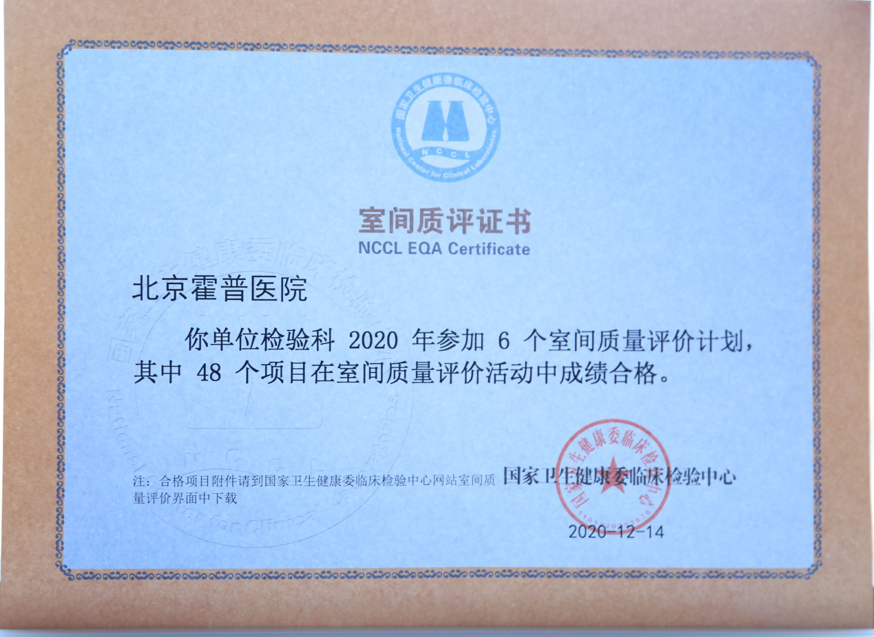 医疗质量是立院之本,北京霍普医院在医务科及院感办公室的指导下,经过全体员工的努力,不断提升医疗质量,建立严格的诊疗流程,取得了显著的成绩。在北京市昌平区卫健委组织的院感考核中,取得了99.5分的成绩,并积极参加了昌平区的“三好一满意”评比;霍普检验科在参加的6个室间质评计划中,48个项目在室间质量评价活动(NCCL)中成绩合格,获得了国家卫建委临床检验中心颁发的“室间质评证书”。